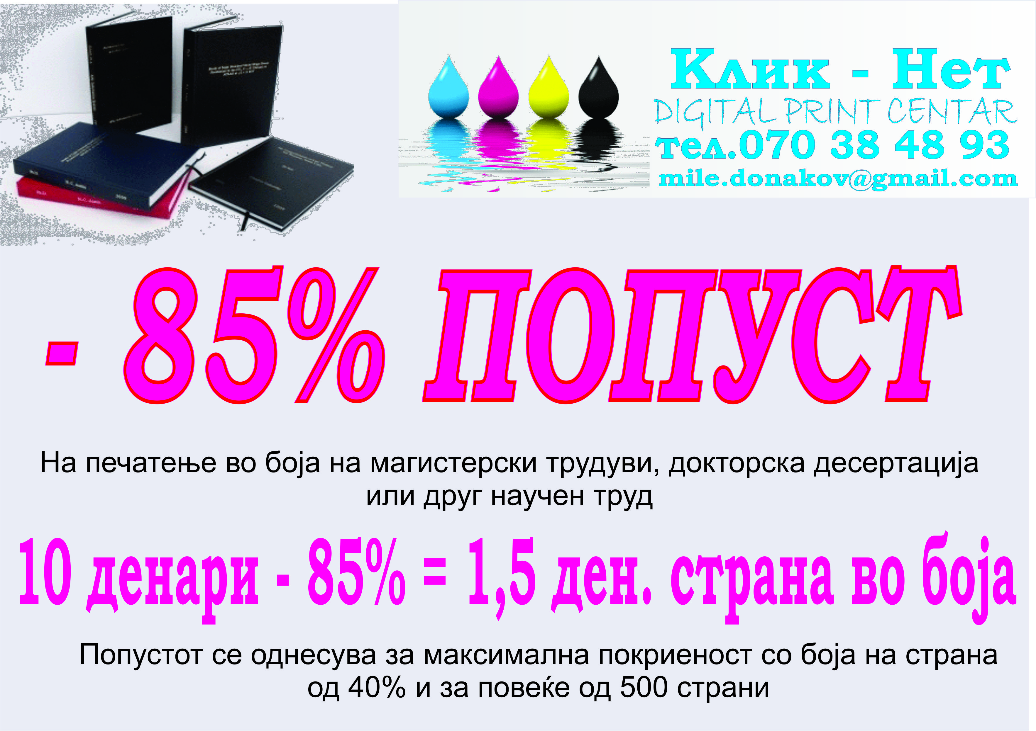 Услуги ДИГИТАЛНО ФОТОКОПИРАЊЕ И ПЕЧАТЕЊЕ - ЦРНО БЕЛО ДИГИТАЛНО ФОТОКОПИРАЊЕ И ПЕЧАТЕЊЕ ВО БОЈА СКЕНИРАЊЕ Повеќе... Повеќе... Повеќе... МЕЃУНАРОДНИ ТЕЛЕФОНСКИ РАЗГОВОРИ УКОРИЧУВАЊЕ - ТВРД ПОВЕЗ - ПЛАСТИФИЦИРАЊЕ ПЕЧАТЕЊЕ ВО ГОЛЕМИ ФОРМАТИ - ПЛОТИРАЊЕ Повеќе... Повеќе... Повеќе...